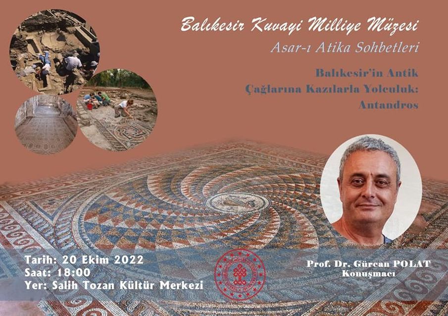 Balıkesir Valiliği İl Kültür ve Turizm Müdürlüğümüz tarafından periyodik yapılacak olan ilki 20 Ekim 2022 saat 18:00 de Balıkesir Salih Tozan Kültür Merkezinde gerçekleştirilecek “Asar-ı Atika Sohbetleri” nin ilk konuğu, Balıkesir Büyükşehir Belediyesi anasponsorluğunda, Ege Üniversitesi Klasik Arkeoloji Bölümünden Prof Dr. Gürcan Polat başkanlığında yürütülen Antandros Antik Kenti arkeolojik kazıları.. Program kapsamında kazı başkanı Prof Dr Gürcan Polat, “Balıkesir’in Antik Çağlarına Kazılarla Yolculuk: Antandros” konulu bir sunum yapacak.