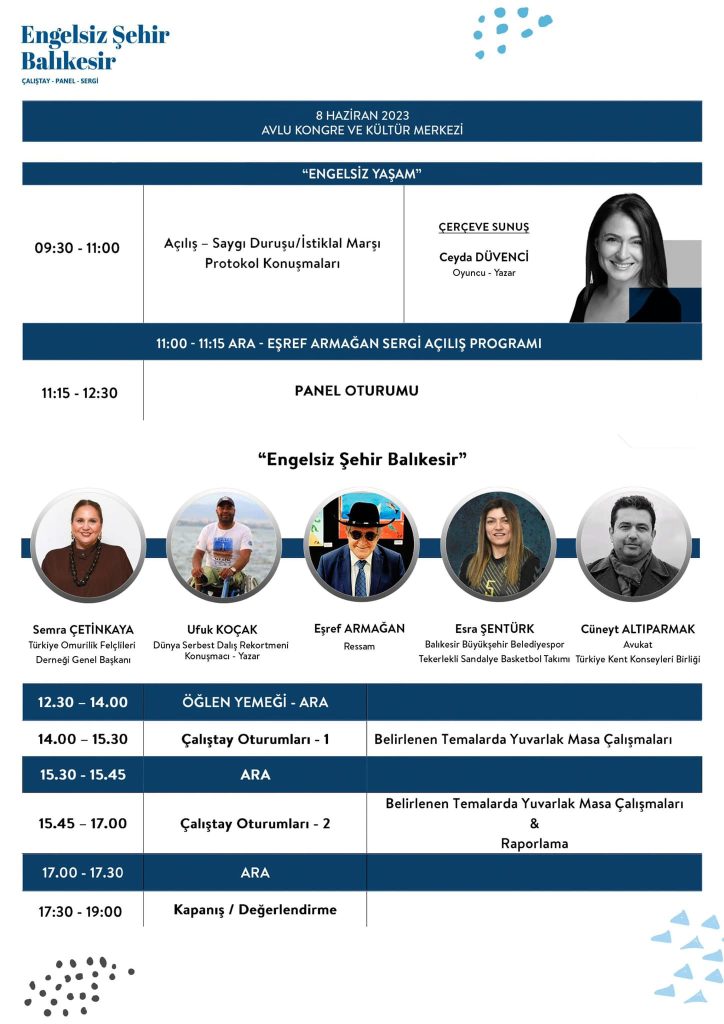Oyuncu-Yazar Ceyda Düvenci’nin engelsiz yaşama dair deneyim ve tecrübelerini paylaşacağı çerçeve sunumunun ardından programın ilk kısmında açılış ve protokol konuşmaları yapılacak, ikinci kısımda ise “Engelsiz Şehir Balıkesir” paneli gerçekleştirilecek. Panelin konuşmacıları ise Türkiye Omurilik Felçlileri Derneği Genel Başkanı Semra Çetinkaya, Dünya Serbest Dalış Rekortmeni Ufuk Koçak, Ressam Eşref Armağan, Balıkesir Büyükşehir Belediyespor Tekerlekli Sandalye Basketbol Takımı Oyuncusu Esra Şentürk ve Türkiye Kent Konseyleri Birliği’nden Avukat Cüneyt Altıparmak. Panelin sonrasında ise belirtilen temalarda yuvarlak masa çalışmalarının yapılacağı programda ayrıca Ressam Eşref Armağan’a ait eserlerin sergileneceği bir sergi düzenlenecek.