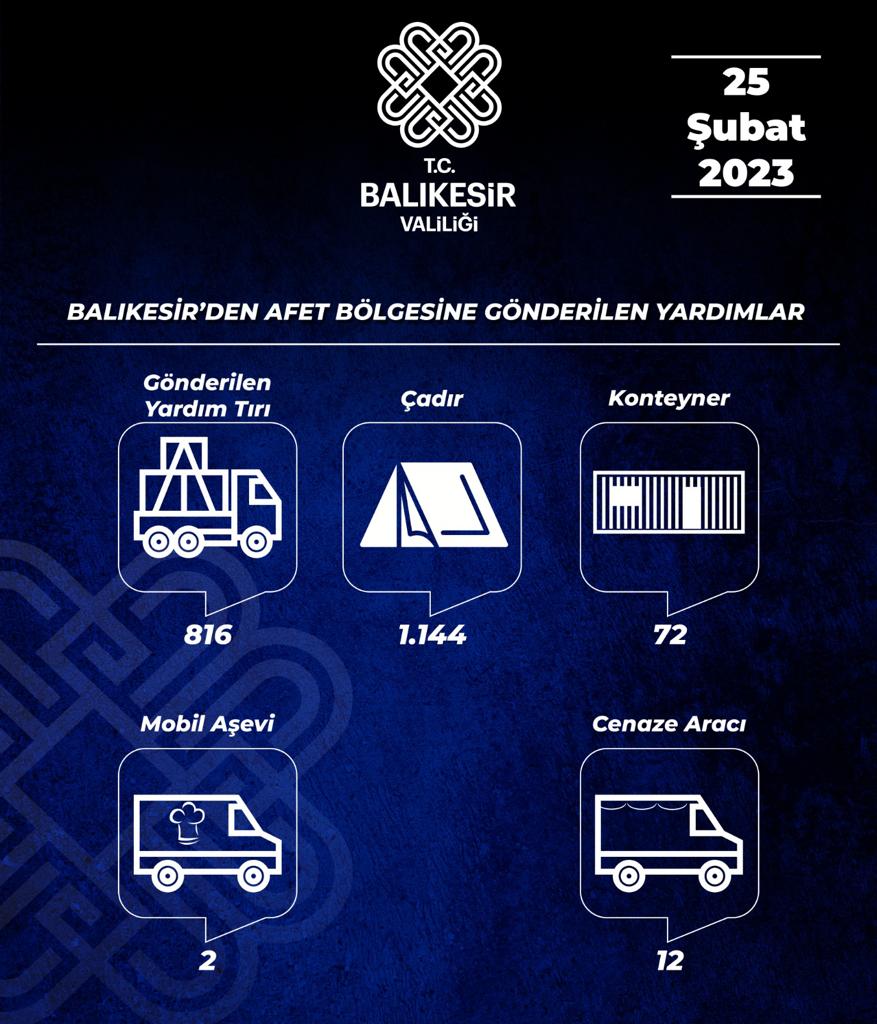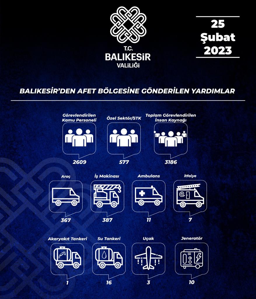 Kahramanmaraş merkezli depremin ardından Balıkesir’den de bölgeye birçok yardım gönderildi. Depremin olduğu günden 25 Şubat tarihine kadar bölgede 2.609 kamu personeli görevlendirilirken özel sektör ve sivil toplum kuruluşlarından 577 gönüllüyle Balıkesir toplamda 3.186 kişiyle insan gücü desteği sağladı.