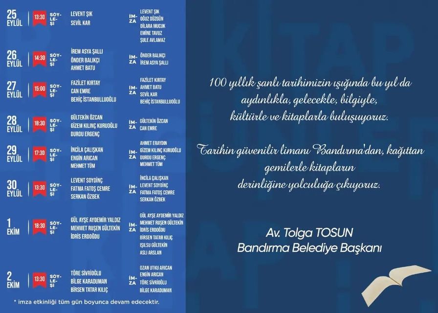 100 yıl önce Ayyıldız tepe’de atılan son kurşun ile bağımsızlığına kavuşan vatan toprağımızda, şanlı tarihimizin ışığında barışın ve huzurun kenti Bandırma’mızda kitapların dünyasına yolculuğa çıkıyoruz.️ 24 Eylül – 2 Ekim 2022, Cumhuriyet Meydanı