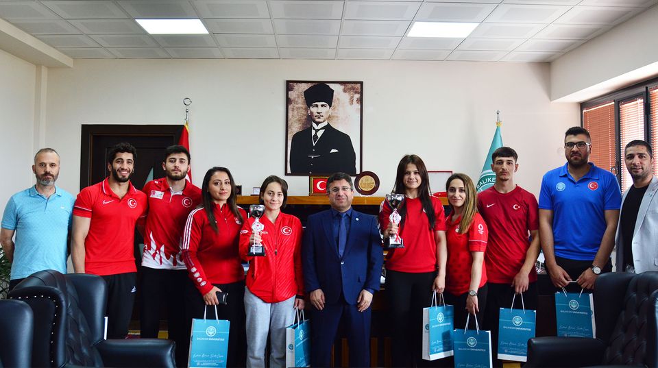 Balıkesir Üniversitesi (BAÜN) Rektörü Prof. Dr. Yücel Oğurlu, Üniversiteler Judo Türkiye Şampiyonasında üniversiteyi başarıyla temsil eden sporcu öğrencilerle bir araya geldi. Sinop’ta gerçekleştirilen Üniversiteler Judo Türkiye Şampiyonasında 2 altın, 1 gümüş ve 9 bronz madalyanın yanı sıra; takımlarda bir ikincilik, bir de üçüncülük kupası kazanan Balıkesir Üniversitesi Judo Takımı, beraberlerinde Takım Sorumluları Doç. Dr. Özkan Işık ile birlikte Rektör Prof. Dr. Yücel Oğurlu’yu makamında ziyaret etti.