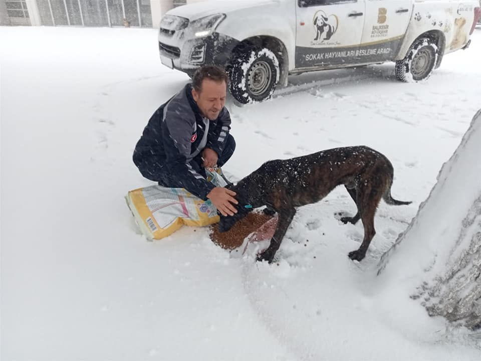 Balıkesir Büyükşehir Belediyesi soğuk ve karlı havalarda gıda bulmakta sıkıntı çeken sokak hayvanlarına yönelik besleme çalışmalarına aralıksız devam ediyor.