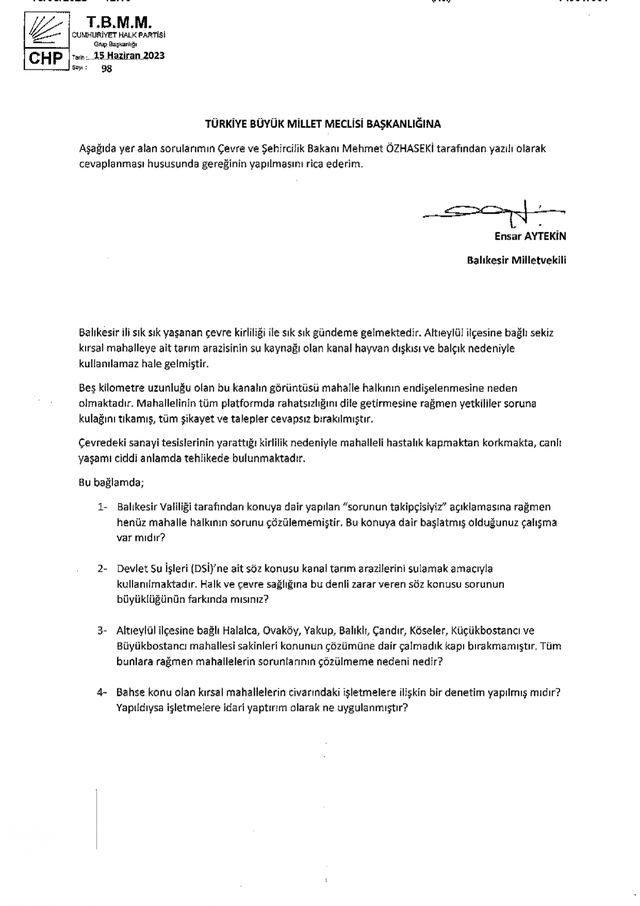 CHP Balıkesir Milletvekili ve TBMM İdare Amiri Ensar Aytekin Altıeylül ilçesine bağlı kırsal mahalleleri etkileyen dere kirliliğini TBMM gündemine taşıdı. Çevre ve Şehircilik Bakanı Mehmet Özhaseki’nin yanıtlaması talebiyle TBMM Başkanlığı’na önerge sunan Aytekin konuya dair şunları söyledi: