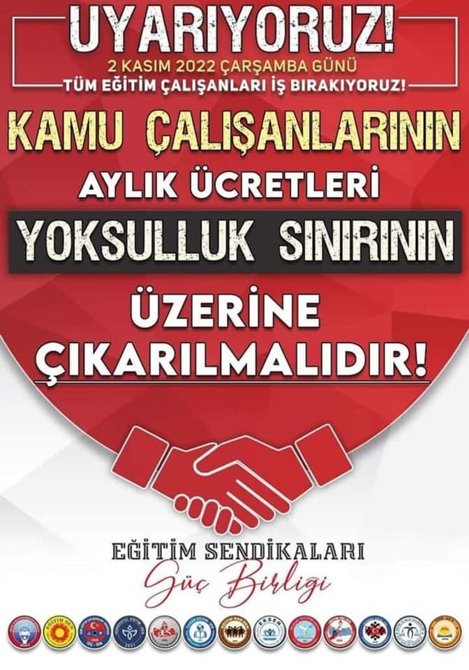 Eğitim İş, Eğitim-Sen ,Teç-Sen,Hürriyetçi Eğitim-Sen,Anadolu Eğitim Sendikası,Özgür Eğitim-Sen,Eğitim Hak-Sen,Eksen ,İdeal Eğitim-Sen ve Eğitim Söz-Sen’in aralarında bulunduğu öğretmenler 2 Kasım’da iş bırakma eylemine gidiyor.