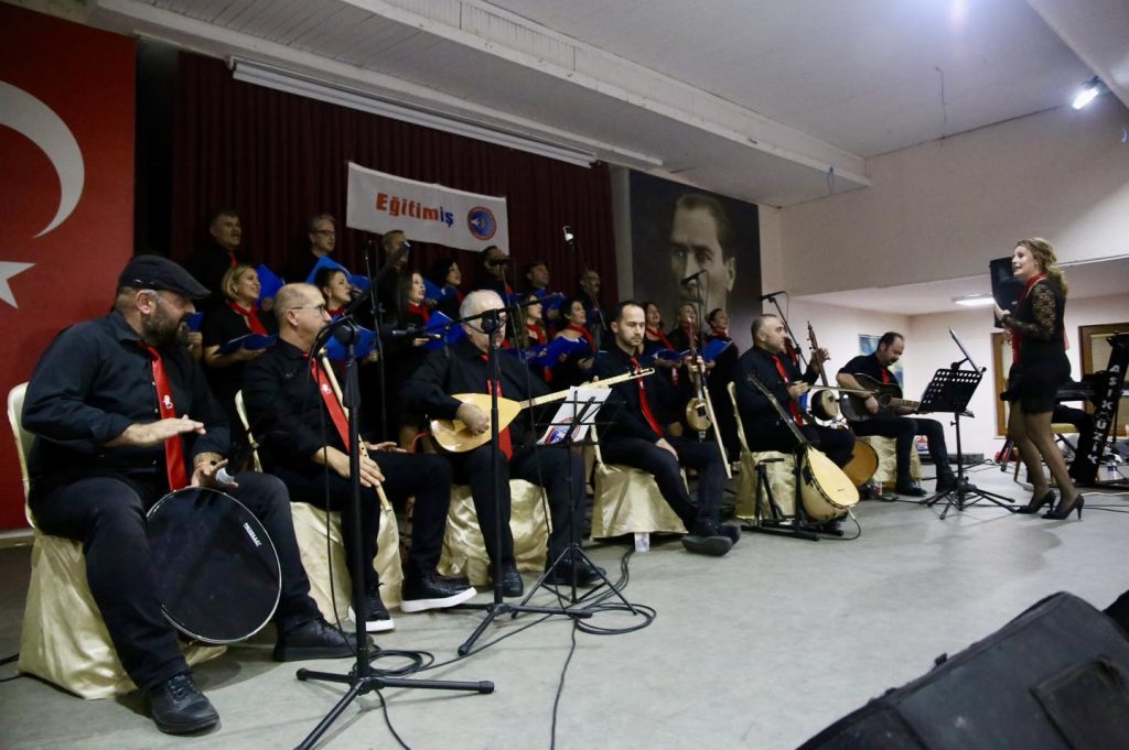 Öğretmenlerden oluşan Eğitim İş Korosu, farklı coğrafyaların eserleri ve Atatürk’ün sevdiği türküler ile sanatseverlere unutulmaz bir konser yaşattı. Koro Şefi Gizem Baydaş tarafından hazırlanan koro, “Deniz Üstü Köpürür”, “Güldaniyem”, “Manastır Türküsü”, “Nar Danesi”, “Gökte Yıldız Ay Misun?”, “Sarı Saçlım Mavi Gözlüm” gibi sevilen eserleri seslendirdi.