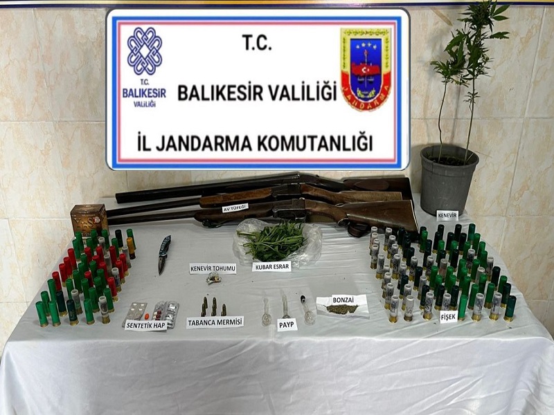 Balıkesir İl Jandarma Komutanlığınca, uyuşturucu madde imal ve ticaretine yönelik Altıeylül ve Kepsut İlçelerinde uyuşturucu madde bulundurduğu ve ticareti yaptığı tespit edilen şüphelilerin araç ve ikamet adresinde yapılan aramalarda, 10.109 gram kubar esrar, 2 kök kenevir, 10 gram bonzai, 8 adet sentetik uyuşturucu hap, 3 adet uyuşturucu kullanma aparatı, 3 adet av tüfeği ve 230 adet fişek ele geçirildi ve olaylarla ilgili 5 şüpheli yakalandı.