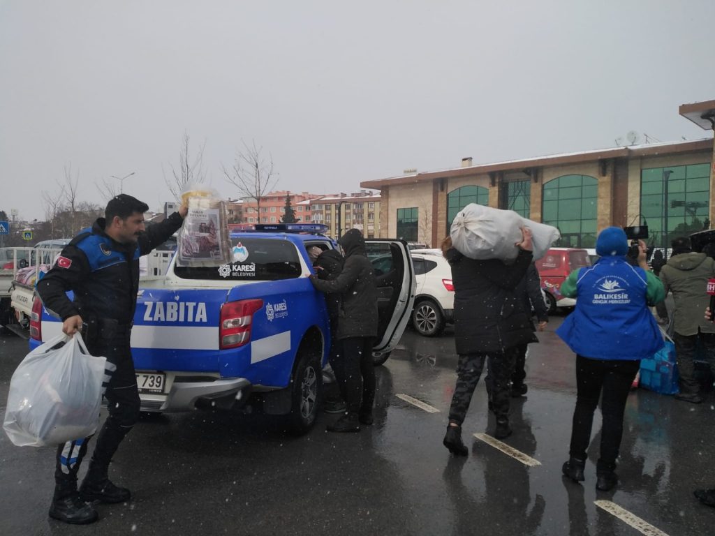 Kahramanmaraş’ın Pazarcık ve Elbistan ilçeleri merkezli meydana gelen depremlerin ardından bölge için seferberlik ilan edildi. Balıkesirlilerde deprem bölgesine ulaştırmak istedikleri yardım malzemelerini belirlenen toplama alanları olan BM 75. Yıl Gençlik Merkezi ve Kurtdereli Spor Salonuna teslim ediyor. Karesi Belediyesi Zabıta Müdürlüğü ekipleri de hava muhalefeti nedeniyle yardımlarını götüremeyen vatandaşlarla, merkez arasında köprü görevi görüyor. Gerek muhtarlıklara bırakılan, gerekse de vatandaşların talepleri doğrultusunda evlere giden ekipler yardım malzemelerini teslim alarak merkezlere ulaştırıyor.