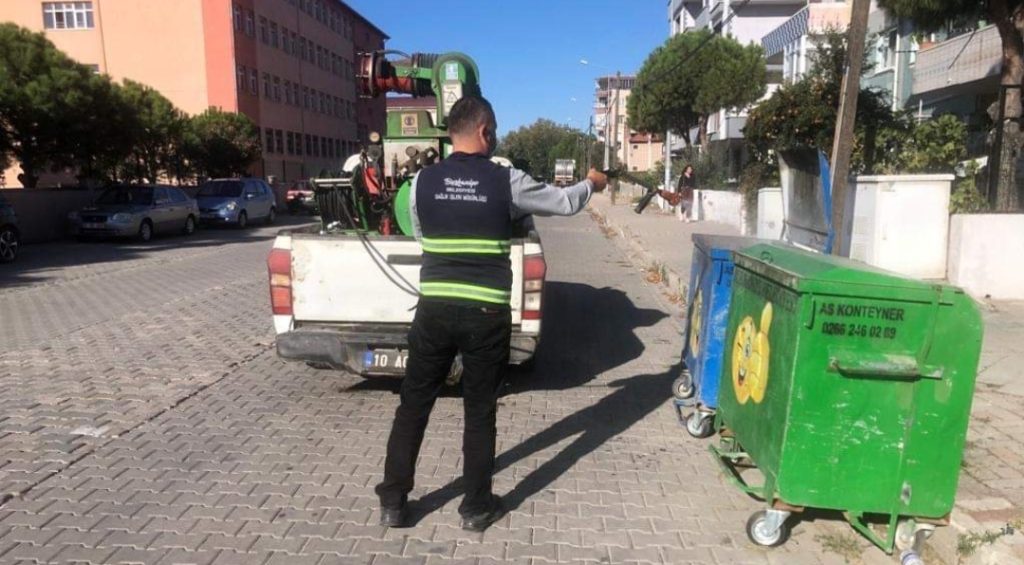 Burhaniye’de kış aylarının yaklaşmasıyla birlikte sivrisinek ve haşeratlar için kışlak ilaçlama çalışmaları Burhaniye Belediyesi Sağlık İşleri Müdürlüğüne bağlı ilaçlama ekipleri tarafından başlatıldı. Merkez ve kırsal mahallelerde yapılan çalışmalar kapsamında ve anaç sivrisinekler için detaylı ilaçlamalar yapılıyor.