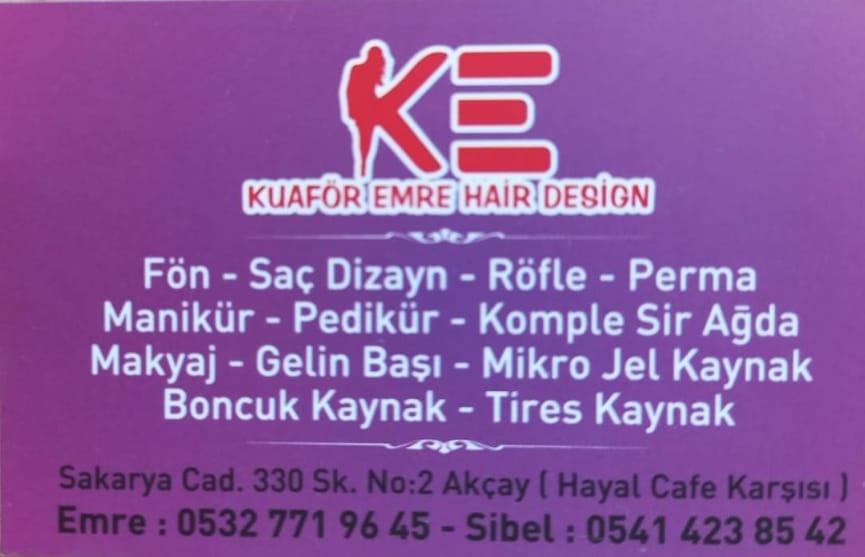 Saç dizayn, fön, röfle, perma, manikür,pedikür, komple sir ağda, makyaj, gelin başı, mikro jel kaynak, boncuk kaynak, tires kaynak yaptığının altını çizen Emre Kuaför; Akçay Sakarya Caddesi 330 sokak Hayal Kahve karşısında faaliyet gösterdiğini söyledi. Randevu sistemi ile çalıştığına dikkat çeken Emre Kuaför, 05327719645 telefondan müşterilerinin ulaşabileceğini ifade etti.