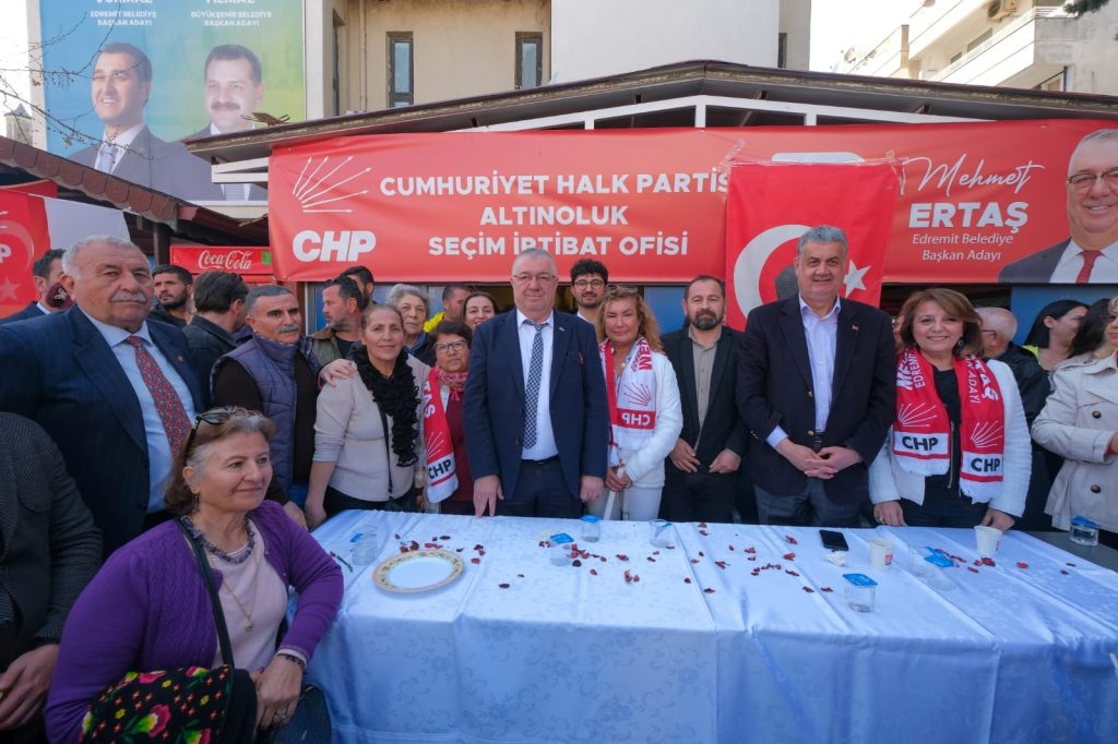 Ertaş; “ Günlük ziyaretlerimiz kapsamında ilçe başkanımız Sn. Av. Emin Yalçıntaş, meclis üyesi adayı yol arkadaşlarım, kıymetli dostum Sn. Cavit Cebeci ve Alevi Kültür Dernekleri Altınoluk şubesi Başkanımız Sn. Veli Doğan’la birlikte Altınoluk Mahallemizde bulunan seçim ofisimizin açılışını gerçekleştirdik. Bizleri çok büyük bir çoşkuyla karşılayıp bağrına basan güzel Altınoluklulara teşekkür ederim” dedi.