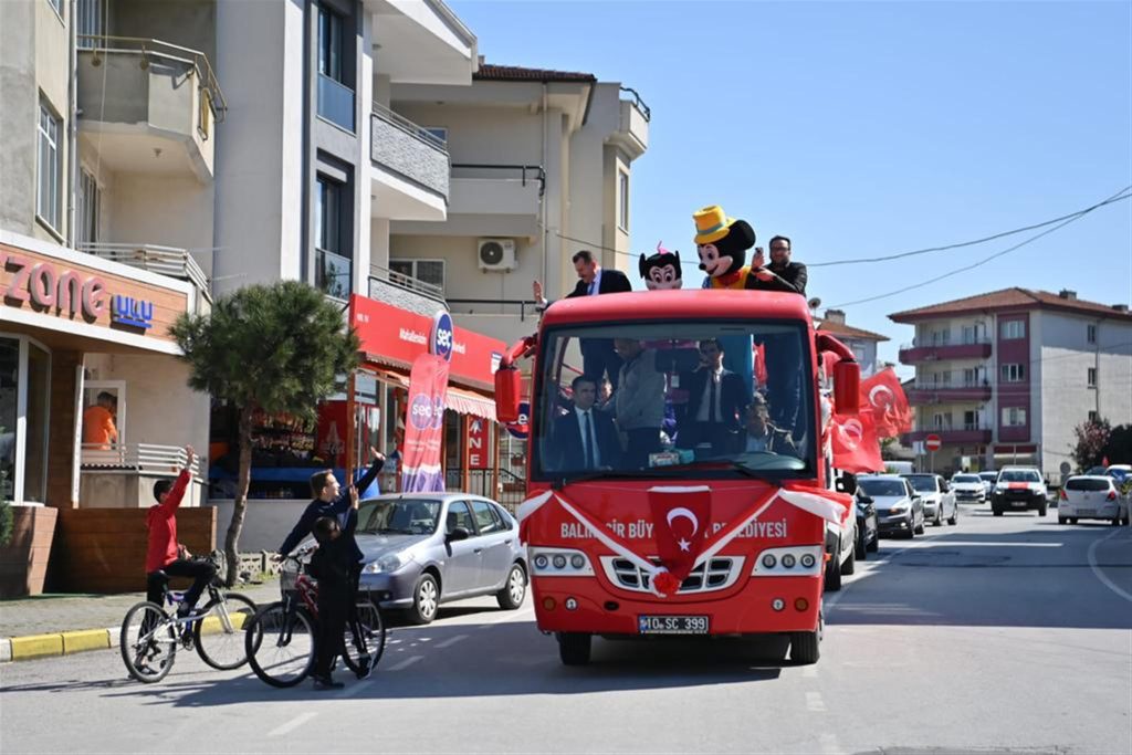 23 Nisan Ulusal Egemenlik ve Çocuk Bayramı’nı muhteşem bir kortej ile kutlayan Balıkesir Büyükşehir Belediye Başkanı Yücel Yılmaz, çocuk şarkılarının çaldığı üzeri açık otobüs ile birlikte şehir turu atarak pencere ve balkonlara çıkan çocukları selamladı.